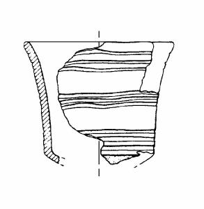 TIPO ISOLONE. Orlo arrotondato. Corpo troncoconico a parete concava. Fondo forse convesso. Decorazione a solcature orizzontali e parallele sulla parete. Colore: grigio.