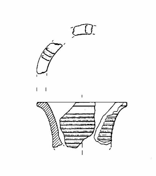TIPO ISOLONE. Orlo piatto marcatamente estroflesso. Corpo troncoconico a parete lievemente concava. Decorazione a solcature sulla parete e sull'orlo. Colore: grigio.