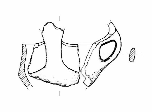 A profilo articolato. Orlo arrotondato e leggermente esoverso. Corpo carenato a parete rettilinea, con diametro dell'orlo inferiore al diametro della carena. Vasca forse a calotta. Ansa a nastro verticale, sopraelevata, con appendice lacunosa. Colore: grigio scuro, con chiazze.