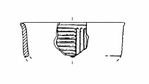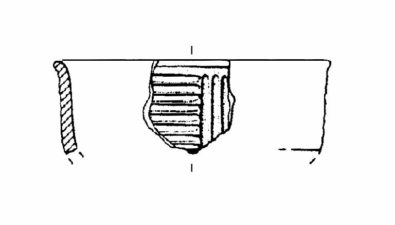 A profilo articolato. Orlo arrotondato ed esoverso. Corpo carenato a parete rettilinea decorata da solcature verticali e orizzontali. Colore: grigio.