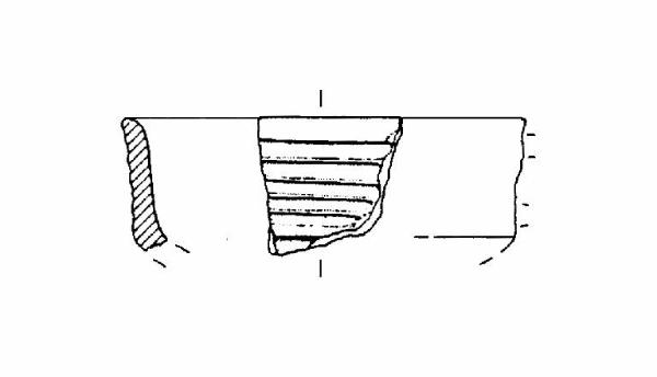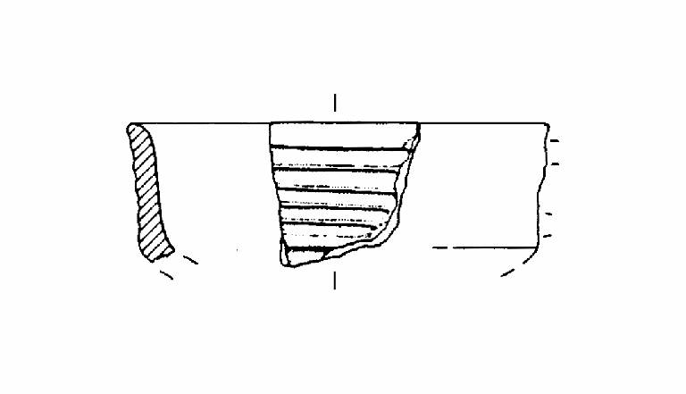A profilo articolato. Orlo arrotondato e leggermente esoverso. Corpo carenato a parete rettilinea, con diametro dell'orlo maggiore del diametro della carena. Decorazione a solcature orizzontali a paralle sulla parete. Colore: grigio scuro.