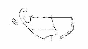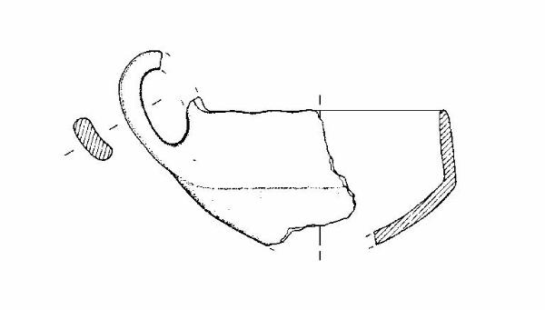 A profilo articolato. Orlo arrotondato modellato a festone. Corpo carenato a parete rettilinea, con diametro dell'orlo inferiore al diametro della carena. Vasca troncoconica. Ansa a nastro verticale, sopraelevata, ad orecchio, impostata sull'orlo e sulla carena. Colore: grigio scuro.