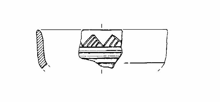 A profilo articolato. Orlo arrotondato. Corpo carenato a parete rettilinea, con diametro dell'orlo leggermente maggiore del diametro della carena. Decorazione a solcature orizzontali e parallele e a triangoli sulla parete. Colore: grigio scuro.