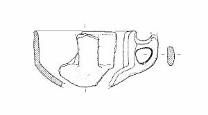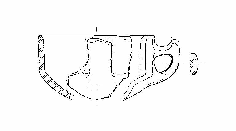 A profilo articolato. Orlo arrotondato e lievemente esoverso. Corpo carenato a parete rettilinea, con diametro dell'orlo uguale al diametro della carena. Vasca troncoconica. Ansa a nastro verticale, originariamente sopraelevata, con appendice lacunosa, impostata 1,4 cm sotto l'orlo e sulla carena. Colore: grigio.