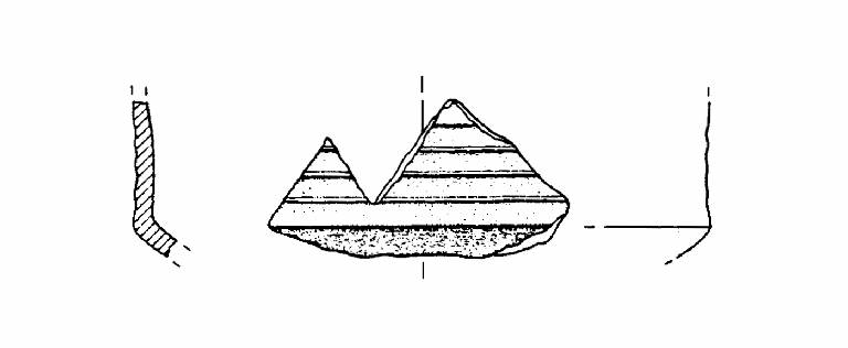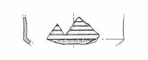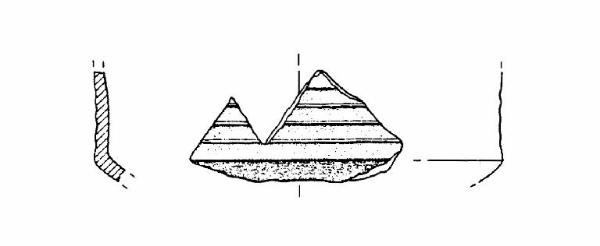 A profilo articolato. Frammento carenato con parete rettilinea. Si conserva un breve tratto della vasca. Decorazione a solcature orizzontali e parallele sulla parete. Colore: grigio scuro.