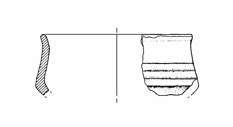 A profilo articolato. Orlo arrotondato e lievemente esoverso. Corpo carenato a parete concava, con diametro dell'orlo inferiore al diametro della carena. Decorazione a solcature orizzontali e parallele sulla parete. Colore: grigio scuro.