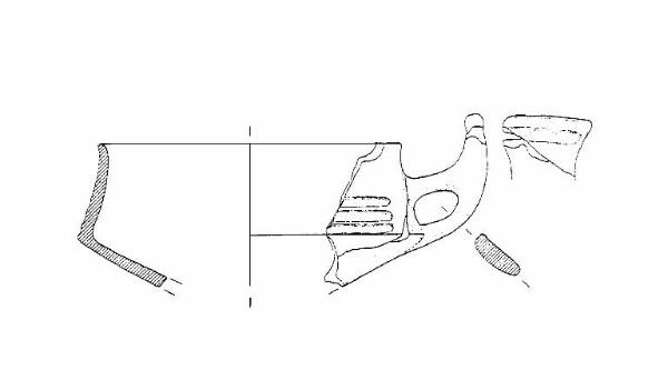 A profilo articolato. Orlo arrotondato e leggermente esoverso. Corpo carenato a parete rettilinea, con diametro dell'orlo inferiore al dimetro della carena. Vasca troncoconica. Ansa a nastro verticale, sopraelevata, ad ascia, con margine superiore lievemente convesso e apici sviluppati, impostata 1,8 cm sotto l'orlo e sulla carena. Decorazione a solcature orizzontali e parallele sulla parete. Colore: grigio scuro.