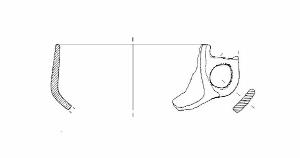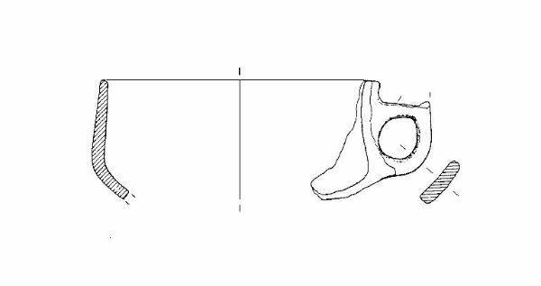 A profilo articolato. Orlo arrotondato. Corpo carenato a parete rettilinea, con diametro dell'orlo inferiore al diametro della carena. Vasca forse troncoconica. Ansa a nastro verticale, originariamente sopraelevata, con appendice lacunosa, impostata 1,5 cm sotto l'orlo e sulla carena. Colore: grigio.