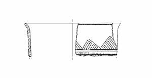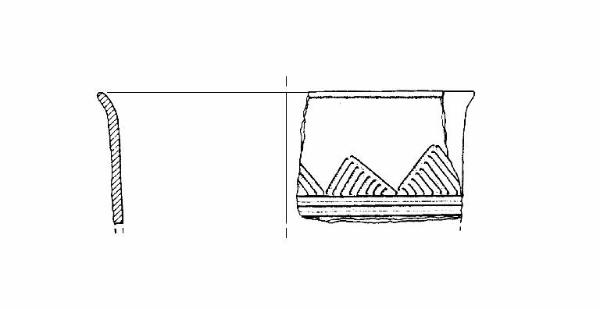 A profilo articolato. Orlo arrotondato ed estroflesso. Parete rettilinea. Decorazione a solcature orizzontali e parallele e a triangoli sulla parete. Colore: grigio, con chiazze.