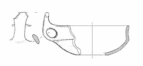 A profilo articolato. Orlo arrotondato e lievemente esoverso. Corpo carenato a parete concava, con diametro dell'orlo uguale al diametro della carena. Vasca a calotta. Fondo esterno piatto. Fondo interno forse ombelicato. Ansa a nastro verticale, sopraelevata, con appendice lacunosa, impostata sull'orlo e sulla carena. Colore: grigio scuro, con chiazze.