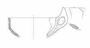 A profilo articolato. Orlo obliquo. Vasca a calotta. Ansa a nastro verticale, sopraelevata, ad ascia, con margine superiore rettilineo e apici sviluppati, impostata sull'orlo e sulla carena. Colore: grigio.