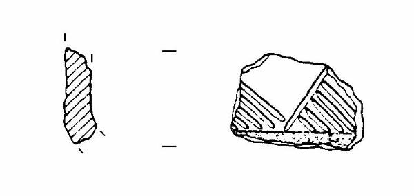 A profilo articolato. Frammento carenato. Parete rettilinea decorata da solcature e a triangoli, posti subito sopra la linea di carena. Colore: grigio.