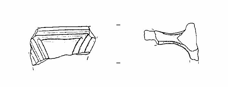 A nastro verticale. Non sopraelevata. Margine superiore rettilineo. Entrambi gli apici sono lacunosi. Decorazione a solcature lungo il margine superiore e i lati della faccia esterna. Colore: grigio scuro.