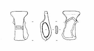 A nastro verticale. Sopraelevata. Margine superiore rettilineo. Decorazione a solcature orizzontali e parallele sulla faccia esterna; motivo a triangolo tra orlo e appendice. Colore: grigio scuro.