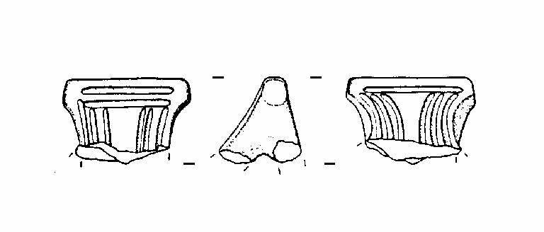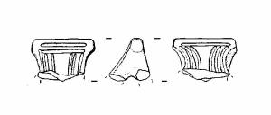 A nastro verticale. Sopraelevata. Margine superiore rettilineo. Decorazione a solcature orizzontali e verticali sulla faccia interna; a solcature orizzontali e ricurve tra orlo e appendice. Colore: grigio scuro.