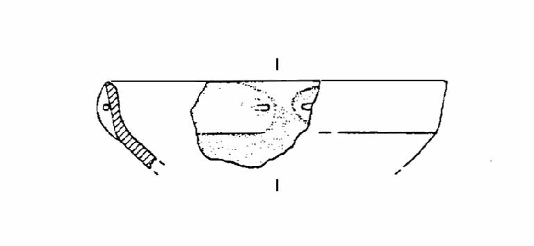 A profilo articolato. Orlo obliquo verso l'interno. Corpo carenato a parete rettilinea, con diametro dell'orlo maggiore del diametro della carena. Vasca forse troncoconica. Ansa canaliculata impostata sull'orlo e sulla carena. Colore: grigio.