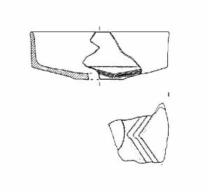 A profilo articolato. Orlo arrotondato. Corpo carenato a parete rettilinea, con diametro dell'orlo leggermente maggiore del diametro della carena. Vasca troncoconica. Fondo piatto. Decorazione con motivo a "V" al di sotto della linea di carena. Colore: grigio scuro.