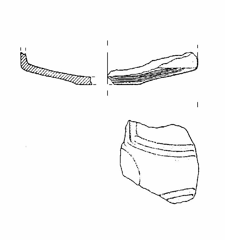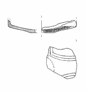 A profilo articolato. Frammento carenato con vasca troncoconica e fondo piatto. Decorazione a solcature al di sotto della linea di carena. Colore: grigio scuro.