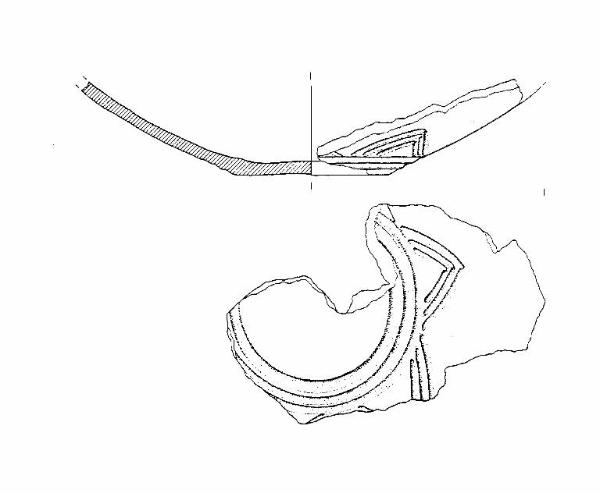 Vasca troncoconica con fondo piatto. Decorazione a solcature concentriche e a triangoli sulla vasca. Colore: grigio scuro.