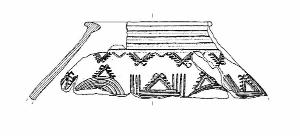 Orlo ingrossato. Parete rettilinea decorata da solcature. Altre solcature orizzontali e parallele subito sotto l'orlo. Colore: grigio scuro, con chiazze.