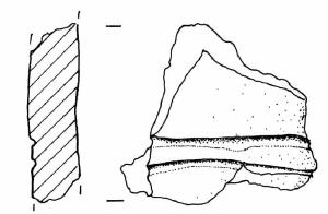 Frammento di parete di un vaso di forma non ricostruibile, decorato con una coppia di incisioni orizzontali parallele a sezione semicircolare. Colore grigio scuro.