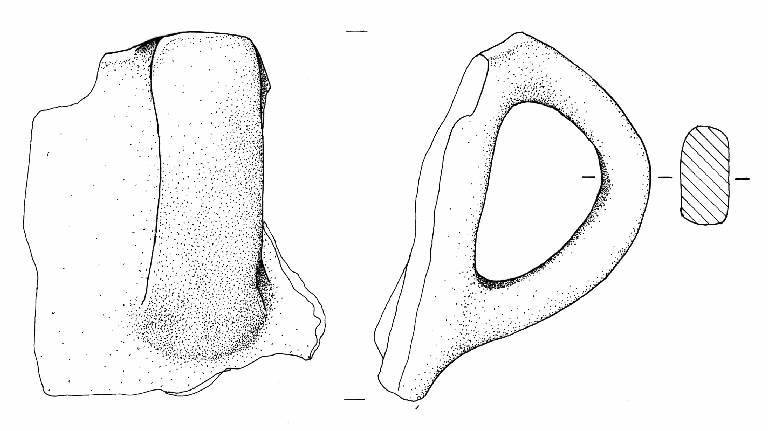 Profilo ad orecchio e leggera apicatura. Sezione subrettangolare. Impostata all'orlo di un probabile vaso troncoconico. Colore grigio scuro con colpi di fiamma beige in corrispondenza dell'ansa.