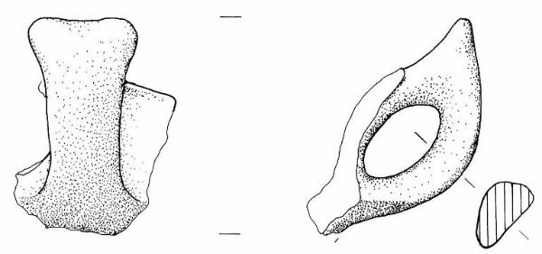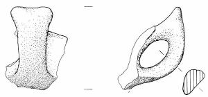Leggermente soprelevata, con appendice asciforme, debolmente lateralmente. Sezione piano-convessa. Impostata su una tazza carenata con orlo esoverso arrotondato. Colore grigio scuro.