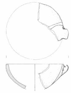 Vasca a calotta, orlo arrotondato e presa a perforazione orizzontale con leggera appendice asciforme impostata poco sotto l'orlo. La vasca presenta una decorazione a doppia linea incisa, probabilmente parte di un motivo cruciforme. Colore grigio scuro.