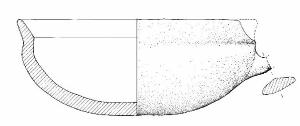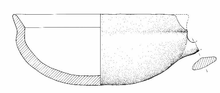 Vasca a calotta, orlo esoverso arrotondato con spigolo interno, fondo piatto. Ansa a nastro impostata tra orlo e carena, di cui si conservano solo gli attacchi. Colore grigio.