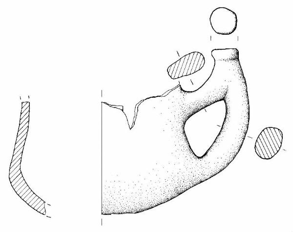 Corpo globoso. Ansa a gomito con ponticello superiore obliquo, dotata di un'appendice a bottone, impostata da poco sotto l'orlo alla massima espansione. Superficie di colore disomogeneo, grigio scuro, beige e arancio.