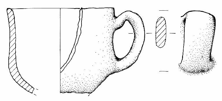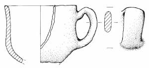 Piccolo boccale a corpo carenato, con parete superiore leggermente concavo e orlo arrotondato. Ansa ad orecchio impostata da poco sotto l'orlo alla carena. Colore grigio.