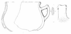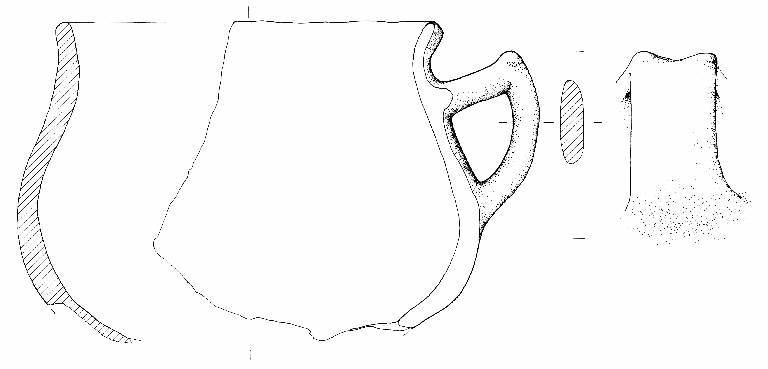Corpo globoso, orlo esoverso leggermente arrotondato, fondo non conservato. Ansa a gomito a sezione ellittica con due protuberanze irregolarmente coniche all'apice, impostata da poco sotto l'orlo alla massima espansione. Colore grigio con colpi di fiamma beige/arancio.