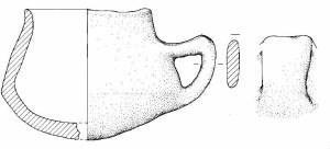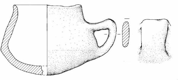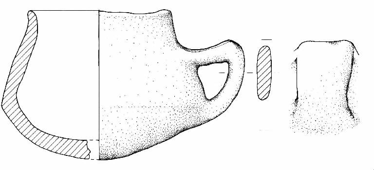 Corpo carenato con carena bassa e parete superiore a profilo rettilineo. Breve orlo esoverso arrotondato e fondo convesso, non conservato interamente. Ansa a gomito con ponticello obliquo a sezione subrettangolare impostata da circa metà della parete superiore alla massima espansione. Superficie di colore disomogeneo, grigio scuro, bruno e beige.