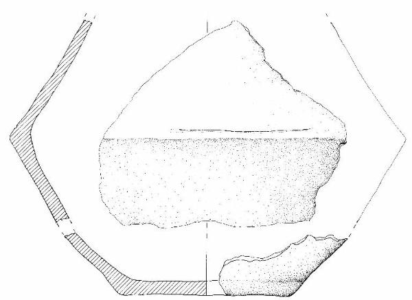 Corpo con carena molto accentuata, sottolineata in un punto da una sottile incisione irregolare, parete superiore leggermente concava. Fondo piatto con tacco arrotondato, molto irregolare. Superficie di colore disomogeneo, grigio scuro, beige e arancio.