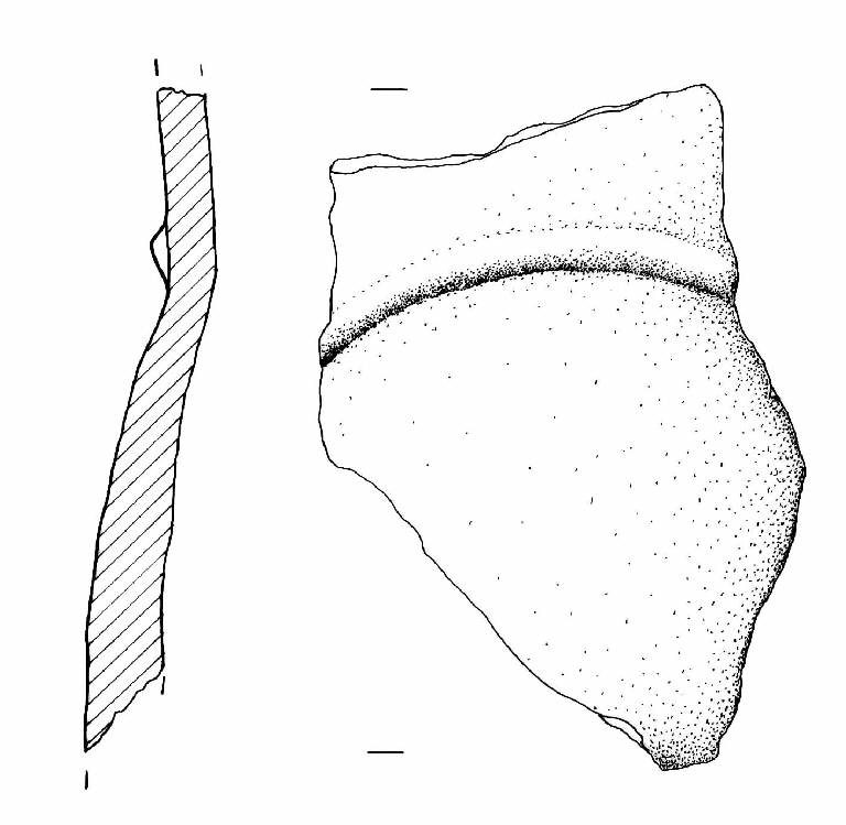 Forma non ricostruibile a causa di una forte deformazione del pezzo. Decorato con un cordone leggermente arcuato a sezione triangolare. Colore grigio scuro.