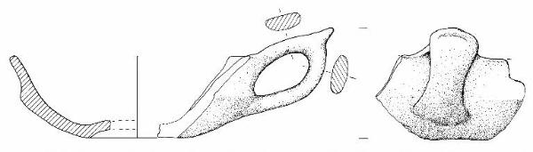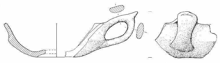 Vasca a calotta, parete distinta svasata, orlo arrotondato e fondo concavo parzialmente conservato. Ansa a nastro soprelevata, con profilo ad orecchio e appendice asciforme. Colore grigio scuro con zone chiare.
