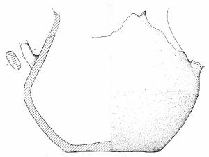 Corpo biconico con carena arrotondata, parete superiore a profilo rettilineo, orlo probabilmente esoverso non conservato, fondo piatto. Si conservano gli attacchi inferiori di due anse, impostate verticalmente a partire da sopra la massima espansione. Superficie di colore disomogeneo grigio e beige.