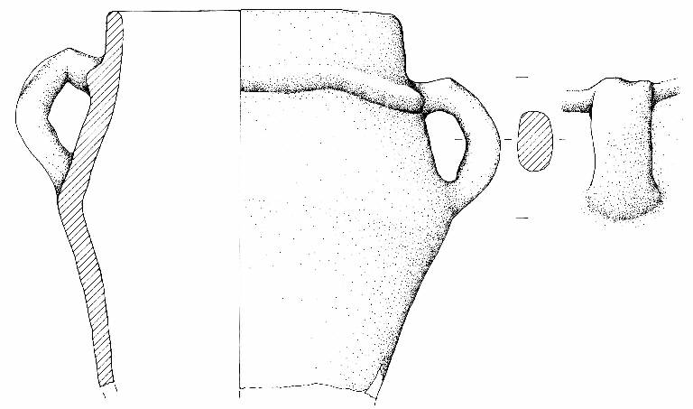 Corpo biconico con parete inferiore a profilo concavo e superiore a profilo diritto, orlo arrotondato. Mancante del fondo. Due anse a gomito, leggermente insellate all'apice, sono impostate simmetricamente da poco sotto l'orlo alla massima espansione. Decorata con un cordone plastico a sezione triangolare, applicato alla metà circa della parete superiore, che si collega agli attacchi superiori delle anse. Colore beige con colpi di fiamma rosati e grigi.