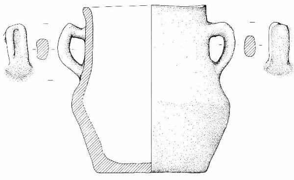 Corpo biconico con carena arrotondata pronunciata, parete superiore rettilinea, orlo arrotondato e fondo piatto. Due anse con profilo a gomito e ponticello obliquo, una leggermente insellata, sono impostate simmetricamente da tre quarti della parete superiore a sopra la carena. Colore grigio scuro con colpi di fiamma arancio.