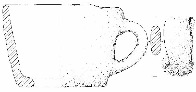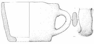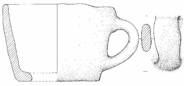Profilo troncoconico leggermente convesso, orlo arrotondato. Non si conserva il fondo, probabilmente piatto. Ansa a nastro con profilo ad orecchio impostata da poco sotto l'orlo a poco sopra il piede. Superficie di colore disomogeneo, grigio scuro, chiaro e arancio.