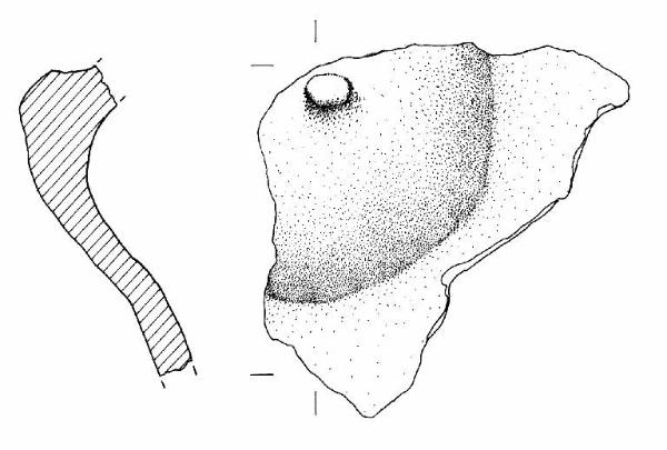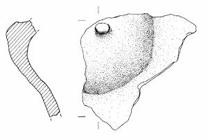 Bozza mammelliforme cava internamente con bugna circolare applicata al centro. Probabilmente pertinente ad un vaso biconico. Colore grigio scuro, con zone più chiare.