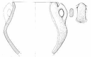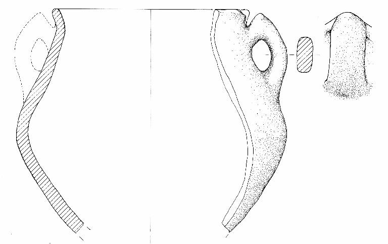 Corpo biconico con carena arrotondata, parete superiore a profilo convesso e orlo diritto arrotondato Si conserva una sola ansa, a gomito, con una leggera apicatura, applicata da poco sotto l'orlo alla massima espansione. Colore grigio scuro.