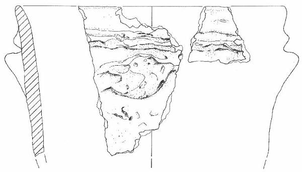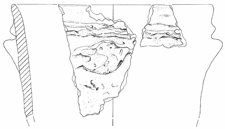 Orlo arrotondato, leggermente assottigliato in sezione, corpo a profilo troncoconico, base piana non conservata. \nSotto l'orlo è applicato un cordoncino orizzontale a sezione triangolare, a tratti con spigolo arrotondato.\nAppena sotto il cordone, distinta, si conserva una presa a linguetta triangolare poco sporgente con apice rivolto verso l'alto. \nColore: da arancio rosato a grigio scuro.