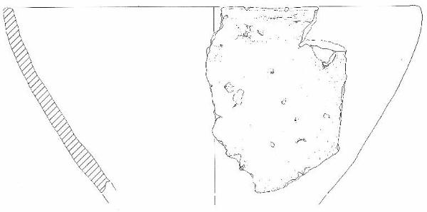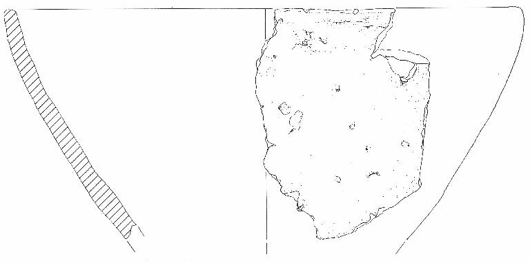 Orlo verticale non distinto piatto, leggermente assottigliato in sezione, vasca troncoconica profonda, con andamento parete leggermente convesso, base piana non conservata. Colore: grigio scuro.