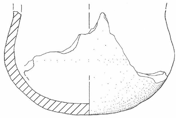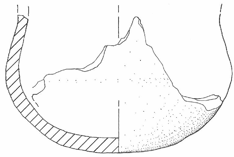 Orlo su labbro esoverso non conservato, corpo globoso sinuoso, base convessa. \nNon si conserva traccia dell'ansa. Colore: da bruno-nero a marrone ad arancio con focature.