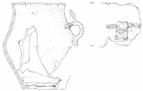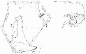 Orlo piatto leggermente esoverso, a tratti assottigliato in sezione, profilo biconico profondo con collo a profilo concavo, spalla arrotondata, base piana.\nSi conserva un'ansa con sezione a nastro piuttosto stretto e largo e profilo ad emicerchio, impostata fra poco sopra il punto di max espansione e il collo: dall'attaccatura superiore si sviluppano nei due sensi due listelli plastici applicati orizzontali, a sezione trapezoidale, di fattura poco curata.\nSulla parete del recipiente all'altezza del punto di max espansione si conservano, a gradi 100 e 190 circa dall'ansa, accenni di possibili piccoli elementi decorativi o di presa: un possibile accenno di bugnetta o piccola presetta e un'ampia sbrecciatura di superficie, causata forse dal distacco di un elemento decorativo o di presa apllicato. Colore: da grigio scuro a bruno-nero.