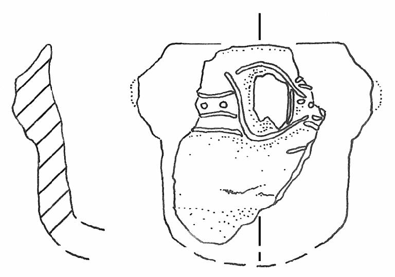 Orlo leggermente rientrante, arrotondato e decisamente assottigliato in sez, corpo cilindrico, base piano-convessa. \nReca appena sotto l'orlo una minuscola presa verticale di forma trapezoidale ottenuta pizzicando l'impasto ancora molle della parete. \nAll'altezza della presetta si conserva una decorazione costituita da una banda orizzontale costituita da tre sottili linee incise e da una linea di puntini impressi, posta fra la prima e la seconda linea incisa; due sottili tratti curvi incisi corrono intorno alla presetta. Colore: bruno.
