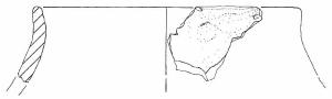 Orlo diritto piatto liscio, quasi a formare un breve colletto verticale all'imboccatura, profilo chiuso, globoso o sua variante, spalla ventre e base piana non conservate.\nNon si conserva traccia dell'ansa o di altri elementi di presa. Colore: bruno-nero.