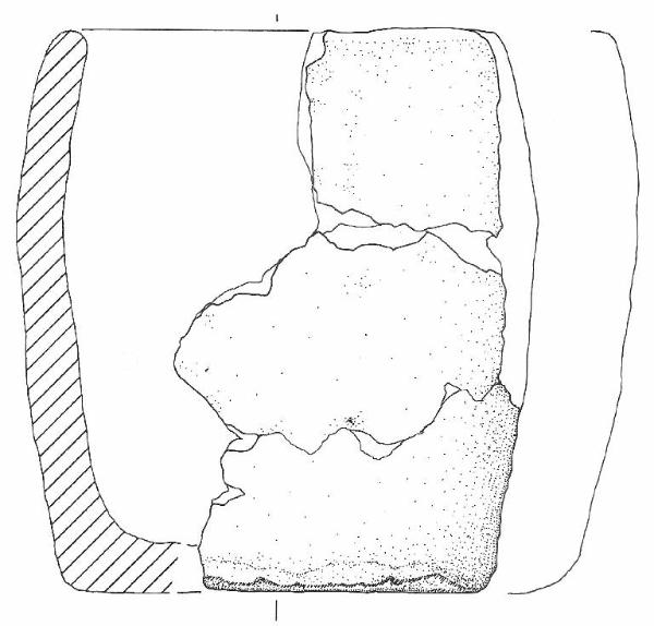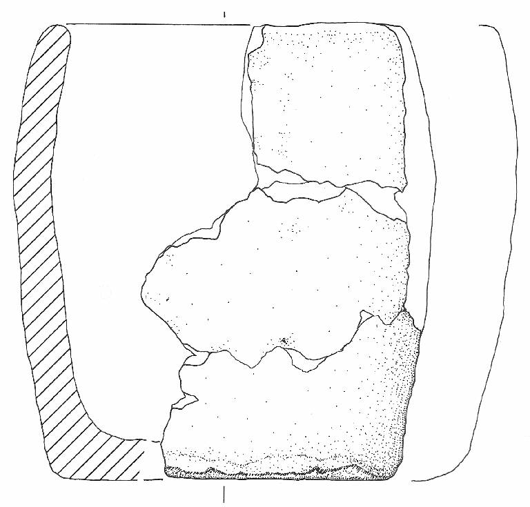 Orlo leggermente rientrante, arrotondato in sezione, corpo a profilo complessivamente cilindrico con parete ad andamento convesso, max espansione a circa metà dell'altezza, base piana. \nNon si conserva traccia di anse o altri elementi di presa. Colore: grigio chiaro.