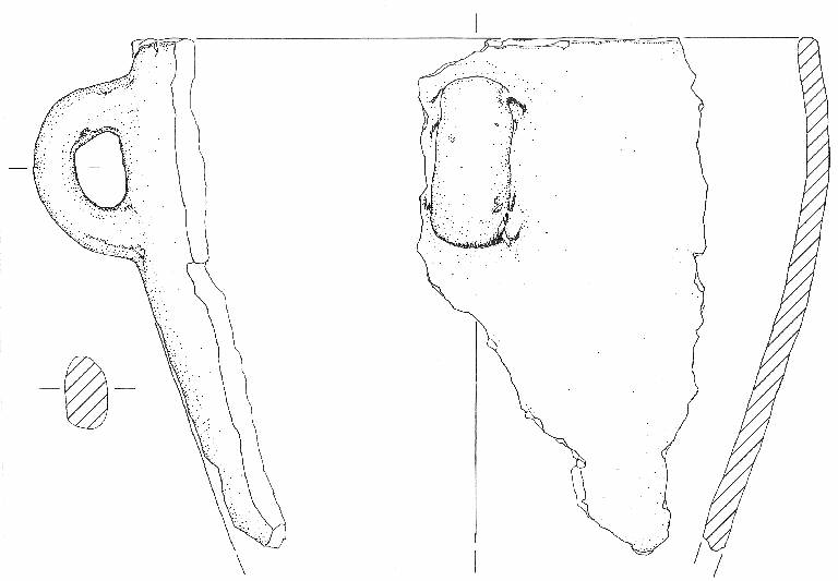 Orlo piatto liscio su labbro leggermente rientrante, corpo profondo a profilo troncoconico con parete ad andamento leggermente convesso, base piana non conservata. \nReca appena sotto l'orlo un'ansa con sezione a nastro spesso e stretto e profilo ad orecchio. \nColore: da beige a grigio-nero con ampia focatura arancio e grigio-blu.